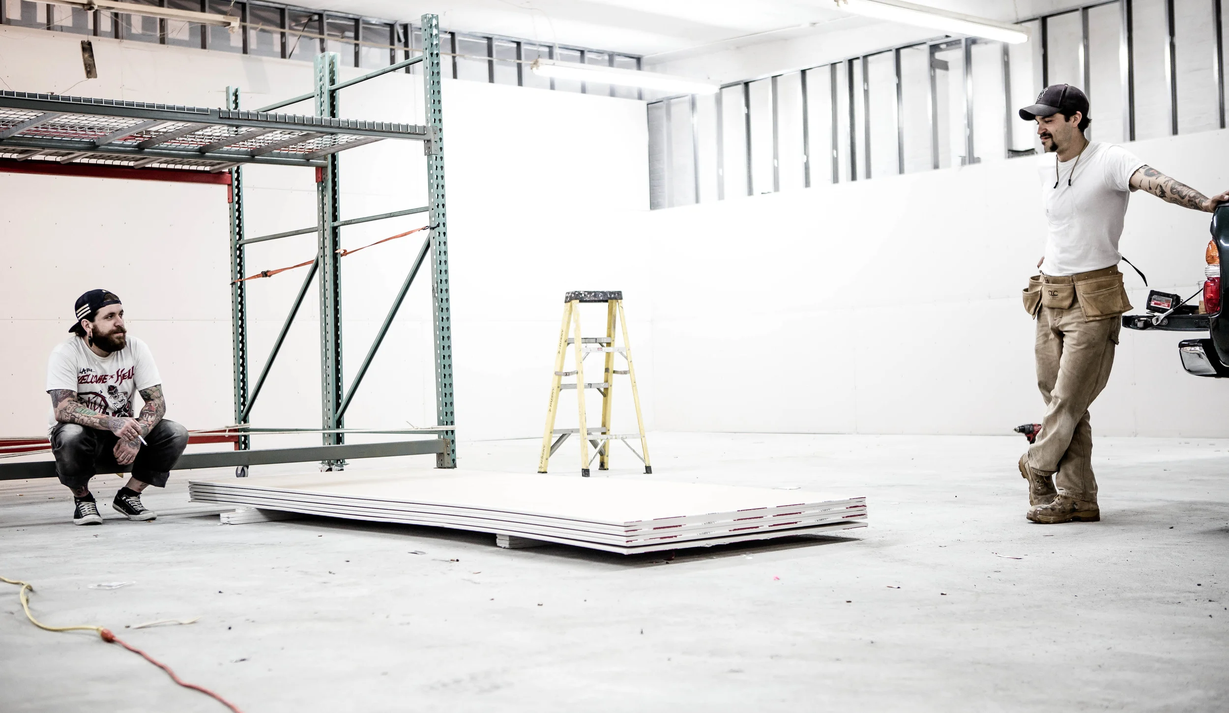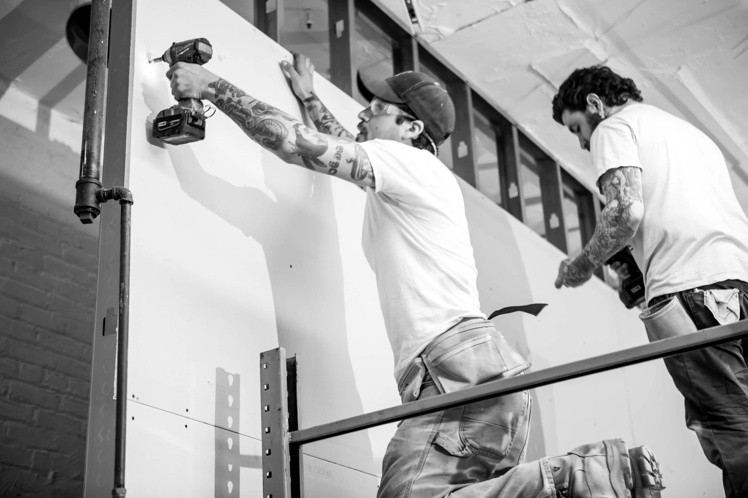 Joe and Max begin to install the cyc at Be Electric Studios.