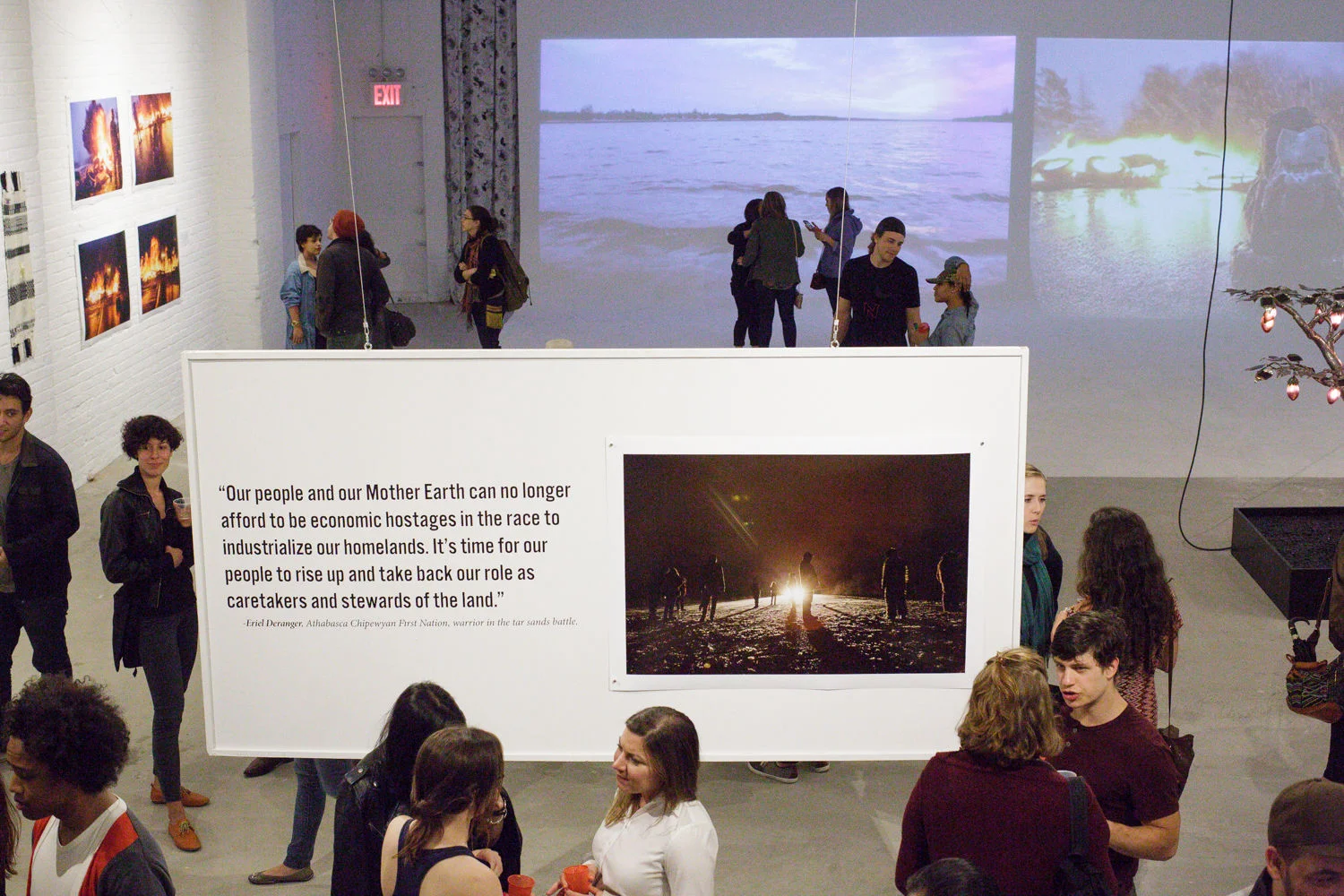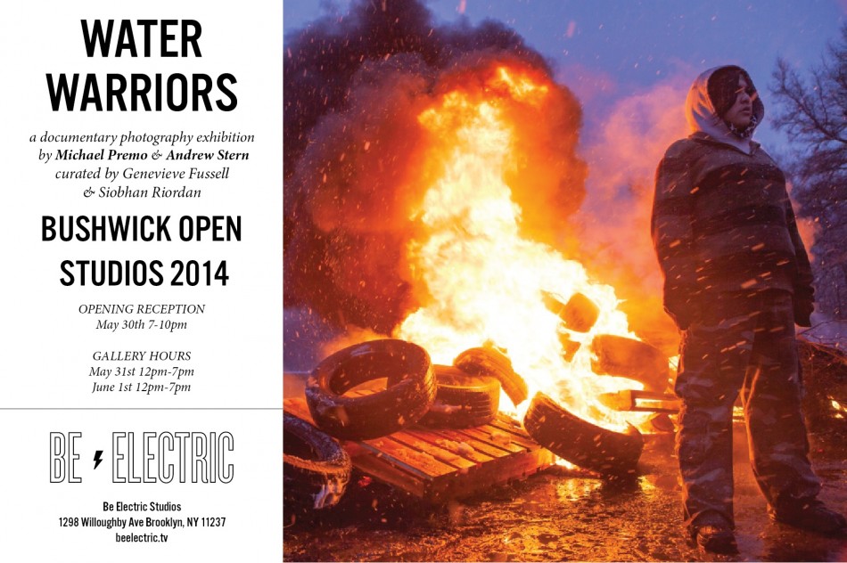 Water Warriors was Be Electric's inaugural event, featuring photography, videography and sound installation by Michael Premo and Andrew Stern. It premiered during Bushwick Open Studios when 600 studios in our hood opened their doors to the public. This year was the biggest ever, and Water Warriors was our way of welcoming everyone to our new space. Many thanks to all the people who volunteered their time to help us put it together, we couldn't have done with without you. The exhibition was well received, and we were chosen by BOS as one of the top ten must see exhibits. We also made the front page of Free Williamsburg. The exhibit explores the issue of fracking, and had a powerful impact on those who attended the show. From the exhibit's text: In rural New Brunswick, Canada an indigenous community and non-native locals have dared to challenge one of today’s most powerful forces: the wildly lucrative oil and gas boom sweeping North America. When a Texas energy company began searching for natural gas last year, these unlikely warriors united to try to drive out the company — and the Canadian police — in an ongoing campaign to protect their land and water. This is an intimate peek behind the scenes of what The Guardian has called “the frontline of a democratic fight.”