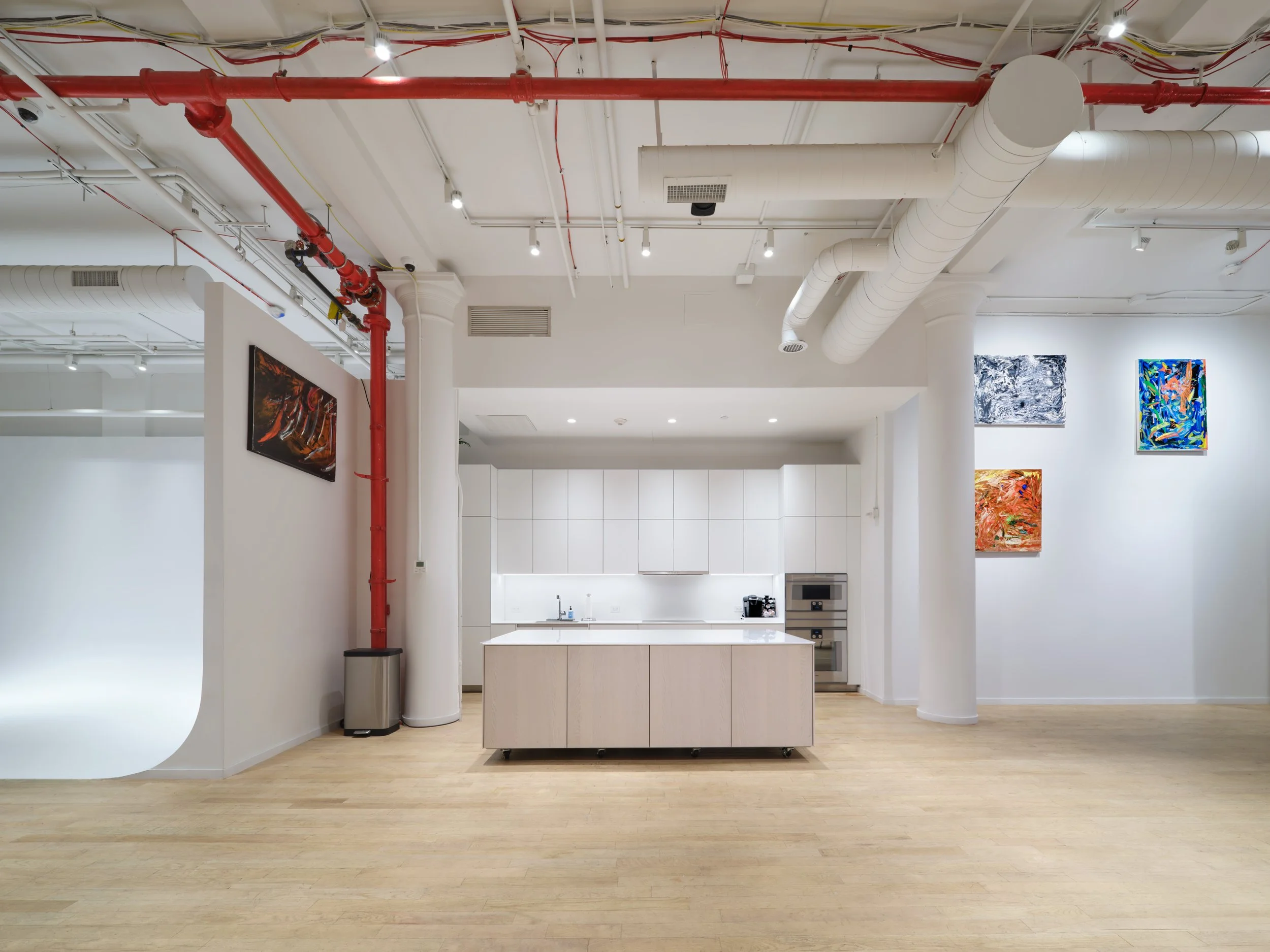 Studio B is a 3,500 sq. ft. facility, with convenient street-level access and proximity to subway trains, featuring a stunning, fully equipped kitchen, a corner cyclorama, private rooms, and a production office.
